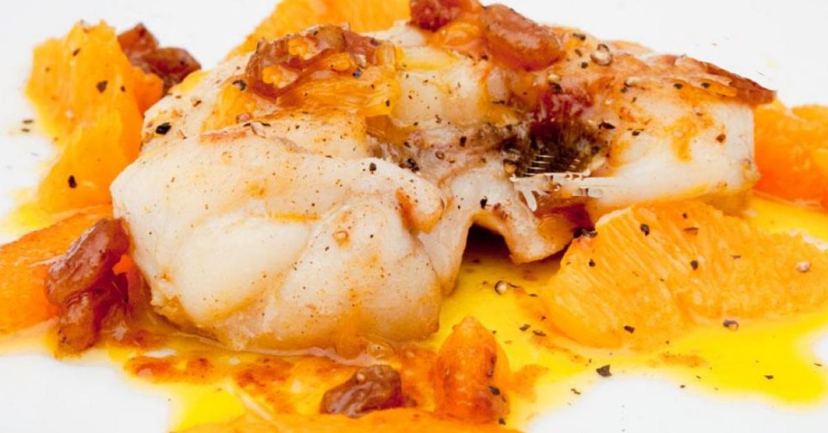 Seeteufel mit Pinienkern-Oliven-Kruste Zucchini und Mandarinenöl.